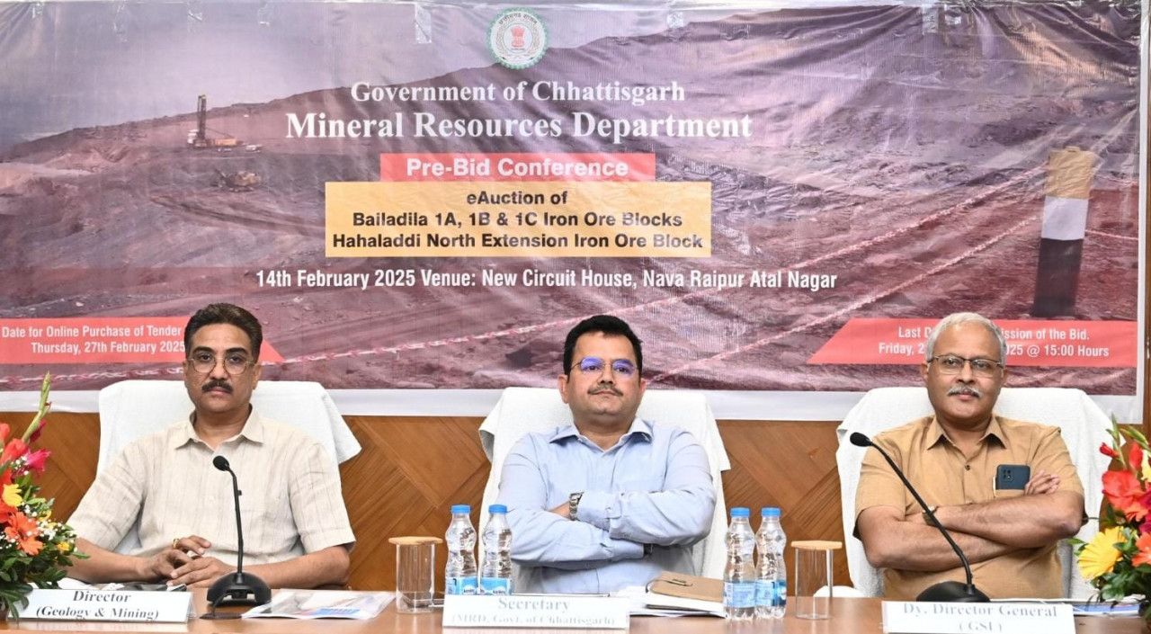 संचालनालय भौमिकी एवं खनिकर्म, छत्तीसगढ़ द्वारा बस्तर के बैलाडीला क्षेत्र के लौह अयस्क ब्लॉकों की नीलामी को लेकर आज नवा रायपुर के न्यू सर्किट हाउस स्थित कन्वेंशन हॉल में ‘प्री-बिड कॉन्फ्रेंस’ का आयोजन किया गया। इस बैठक में देशभर से आए खनन निवेशकों और बोलीदाताओं ने भाग लिया, जहां नीलामी प्रक्रिया, निवेश अवसरों, और खनिज संसाधनों पर विस्तृत चर्चा हुई।