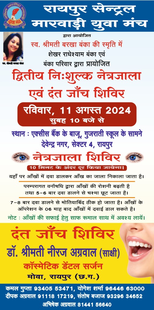 रायपुर सेंट्रल मारवाड़ी युवा मंच द्वारा स्व.श्रीमति बरखा बंका की स्मृति में द्वितीय निःशुल्क नेत्रजाला एवं दंत जाँच शिविर रविवार 11 अगस्त सुबह 10 बजे एक्सिस बैंक के बाजू गुजराती स्कूल के सामने देवेंद्र नगर सेक्टर 4 रायपुर में आयोजित की गयी है.