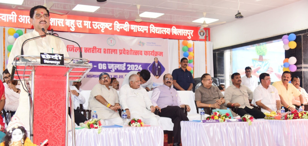 आवास एवं शहरी कार्य राज्य मंत्री, भारत सरकार श्री तोखन साहू आज बिलासपुर स्थित बहुउद्देशीय उच्चतर माध्यमिक विद्यालय दयालबंद में आयोजित जिला स्तरीय शाला प्रवेशोत्सव में बतौर मुख्य अतिथि शामिल हुए। कार्यक्रम की अध्यक्षता उपमुख्यमंत्री श्री अरूण साव ने की। इस अवसर पर नवप्रवेशी बच्चों को माला पहनाकर, तिलक लगाकर गणवेश और पाठ्यपुस्तक का वितरण किया।